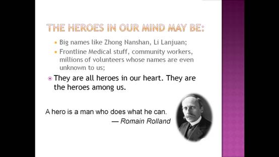在ESS试验班口语课堂中,刘敏副教授结合授课内容中“Hero”(英雄)的主题,从中华优秀传统文化中的民族英雄、伟大领袖、战斗英雄等“big names”(大人物们)讲起,落脚到抗“疫”过程中涌现出的“白衣天使”、警务人员、社区志愿者、“的士”司机、“快递小哥”等“civilian heroes”(平民英雄)。还通过分享班里一位同学捐助防护服的事例,让同学们明白,在特殊时期,尽己所能帮助他人,每个人都可以成为英雄,为抗“疫”做出贡献。