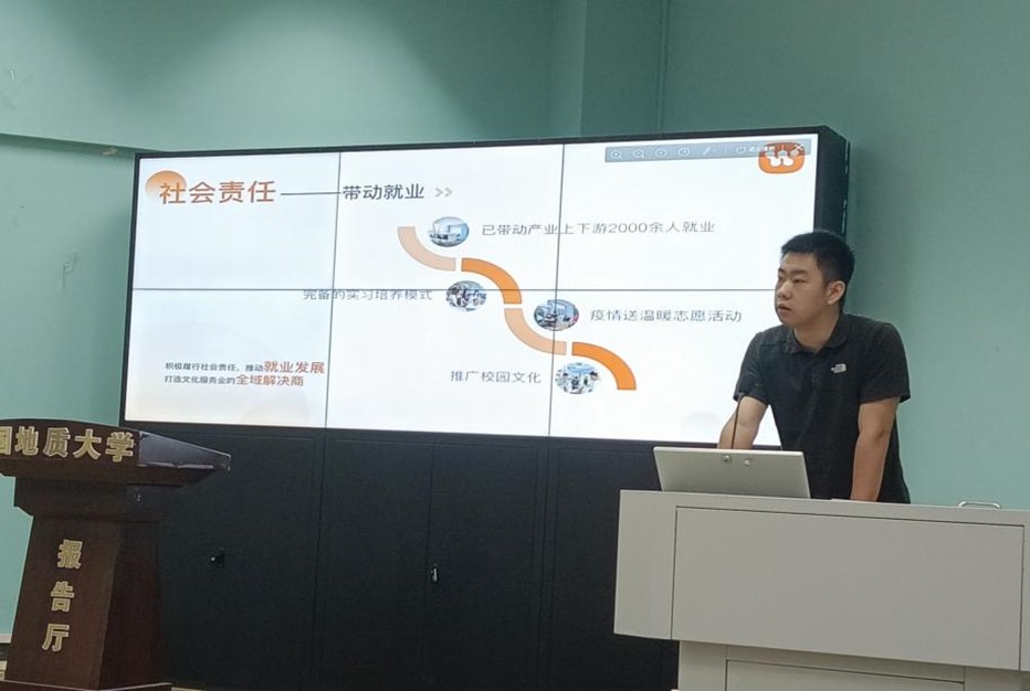 然后,公司艺术与传媒公司大四员工李乐介绍了他创办的武汉松木文化科技有限责任公司的基本情况,包括公司结构、主营业务和社会责任等,并具体说明了该公司如何在文创链方面进行创新,如何在地大校园打造“地心引力”这一高校文创品牌更好地服务广大师生及员工,如何依托公司实际运营业绩积极备战“互联网+”、“三创赛”,这些都引发了同学们的积极思考。