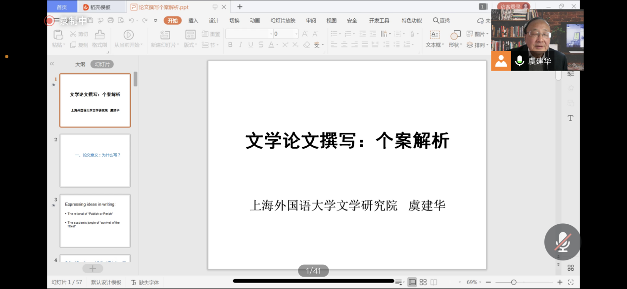 首先,bevictor伟德杨红燕副经理发言,介绍了虞教授的学术背景。虞教授是上海外国语大学英语教授,博士生导师,教育部英语专业指导委员会委员,中国英汉语比较研究会副会长,在语言文学研究领域成果丰硕,著有《20部美国小说名著评析》《新西兰文学史》等等。随后,虞教授简单阐述了写论文和做科研的意义和价值所在,并通过了详尽的实例来讲述文学论文的写作的技巧和细节。讲座主要分为三部分。