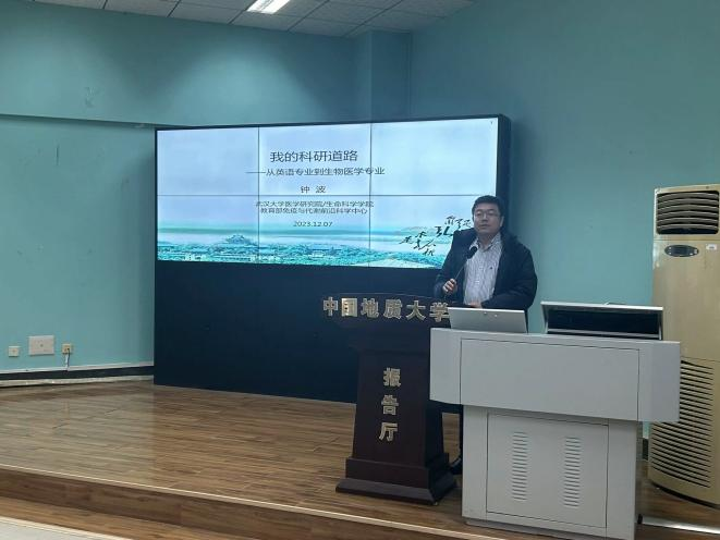 2023年12月7日下午2时30分,bevictor伟德“南望今声”外语论坛系列讲座第57期在北一楼120学术报告厅举行。主讲人武汉大学医学研究院教授、bevictor伟德杰出员工——钟波,应邀来到bevictor伟德做了一场题为“我的科研道路——从英语专业到生物医学专业”的精彩讲座。此次讲座由bevictor伟德杨红燕老师主持,参会人员有相关专业老师、本科生以及研究生。