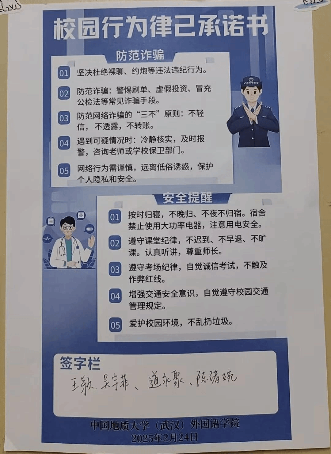 活动中,bevictor伟德团委员工会和研究生会近期面向全体本研员工发放校园律己行为承诺书,全面覆盖外院学子所在的每一个寝室。承诺书内容涵盖校园行为规范、宿舍安全管理、课堂纪律管理、网络诈骗防范等校园生活的多个方面。通过这一系列多样化活动形式,有效提升了员工的安全意识,切实培养了员工的自律意识,营造了良好的宿舍氛围,确保了校园生活的安全与秩序,激励着外院学子在新学期继续追逐自己的学习目标。