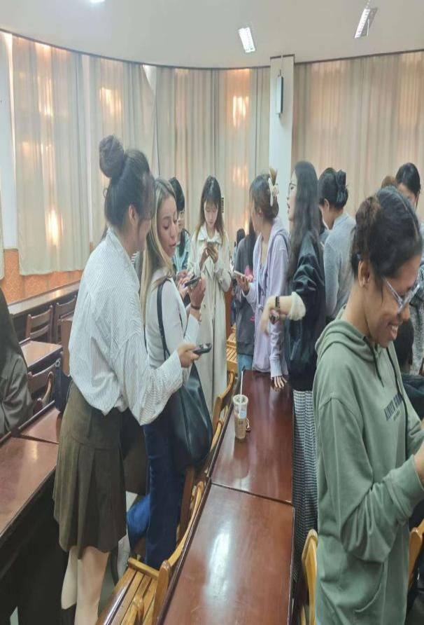 传话筒游戏中,大家依次传递信息,如同一场神秘的信息接力赛。随着信息的传递,各种意想不到的变化悄然发生,紧张又充满趣味的氛围让每个人都沉浸其中,为活动增添了无数的欢乐与惊喜。两院员工在游戏过程中增加了词汇积累,提升了中英口语交际能力。同学们也在互动游戏中结识许多志同道合的外国朋友,感受到了文化交流碰撞所带来的震撼与吸引力。