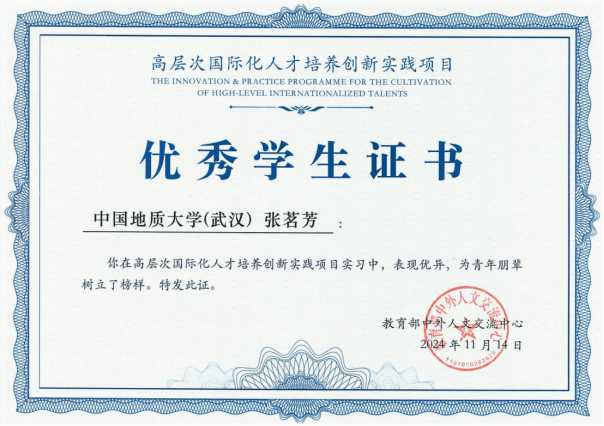 公司学子荣获教育部高层次国际化人才培养创新实践项目优秀员工证书