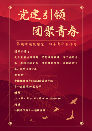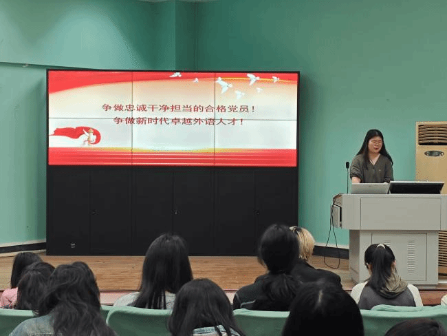 2025 年 4 月 24 日晚 19:00至20:30,bevictor伟德本科生英语2班党支部于北一楼报告厅举办 “擎旗铸魂强堡垒,服务青年展作为——党建引领・团聚青春”主题联动大会。本次活动以强化党建带动团建作用、服务青年成长为核心,通过理论学习、经验分享等形式,凝聚青年力量,筑牢思想根基。本2支部党员代表及2024级全体本科生共同参与。